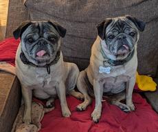 Meet Lulu & Rory, 2 bonded pair pugs. They are 7 & 8 years old. They are housetrained and up to date on shots. Lulu will be spayed soon before adoption. They are active girls, can get up and down stairs and car doors. Their adoption fee is $350.